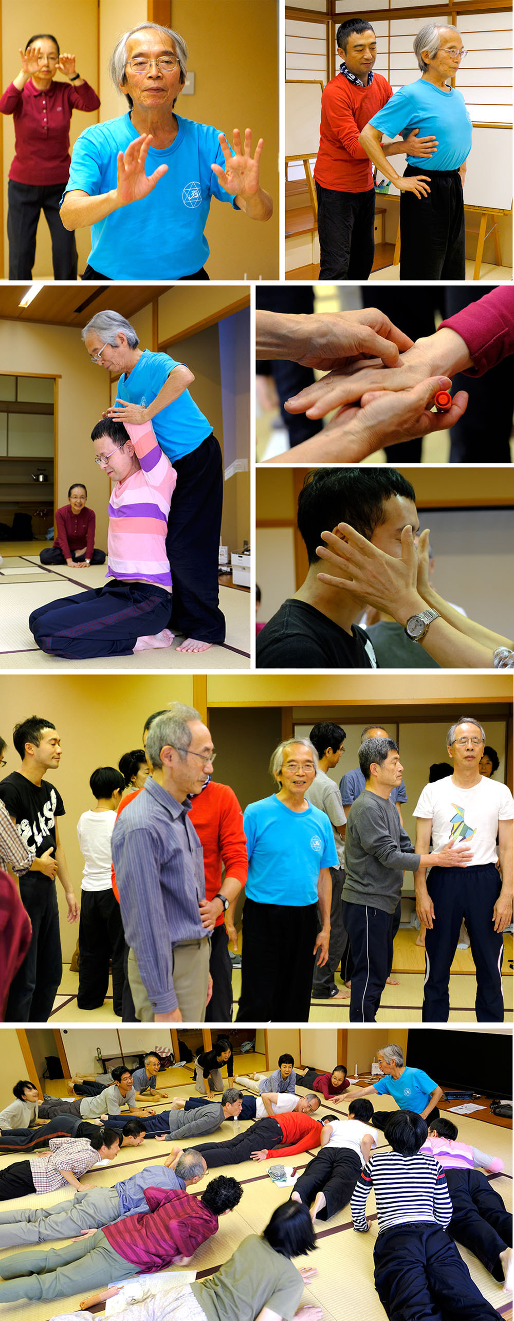 そうした意味からも、野口体操とは縁が深い。当日は、ヨガの呼吸法をベ-スに龍村式呼吸力開発法を実習したのち、二人一組になって、体感的な呼吸の出し入れを相互に学ばせていただいた。
